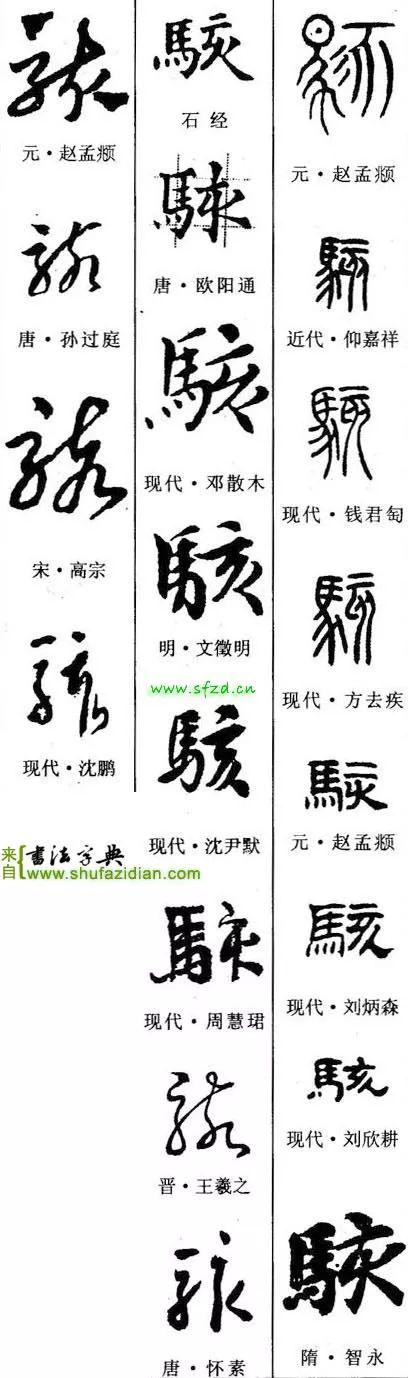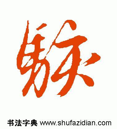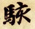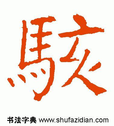 左部“马”字旁斜势抗肩,不要写宽。首笔左竖斜切起笔,竖身稍重,略呈弧形;三个横笔均虚接起笔,大抗肩,勿长,注意变化;中间竖笔实接起笔,略左斜,稍带弧形,与左竖呈相抱之势;横折钩实接起笔,横画与上面横画平行,过中竖即顿笔下行,竖笔左斜,勿重,钩稍大;下面四点可以写成三点,点点呼应,靠上,注意指向。
