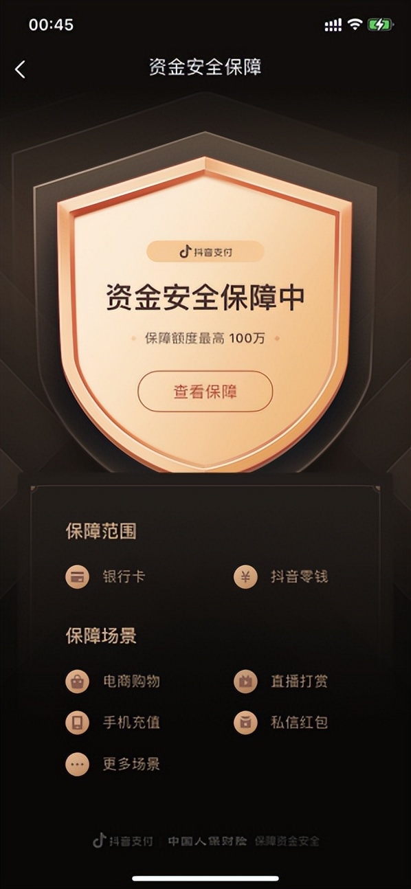 开通免密支付时,很多人都比较担心风险问题。抖音支付当然也帮大家考虑到了这一点。对此,抖音支付和中国人保财险合作,为每个用户提供价值百万的资金安全保障。其中,保障范围包括银行卡和抖音零钱,保障场景不仅覆盖电商购物,直播打赏、私信红包、手机充值等也在保障范围内,能让用户安心使用,放心消费。