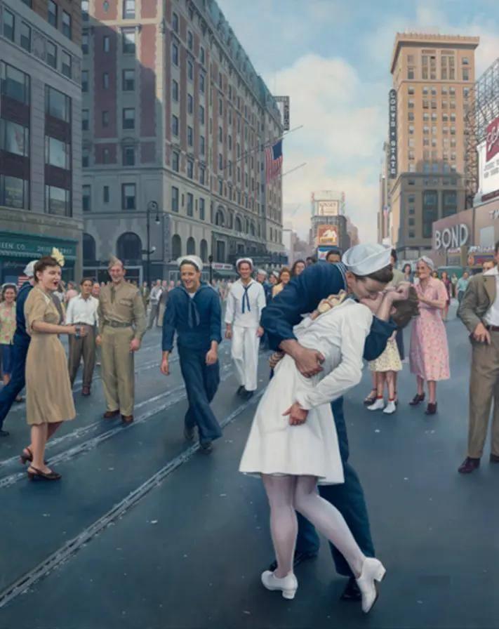 你见过这张照片吗?它是一张名为《胜利之吻》的标志性照片,拍摄于美国时代广场。照片中,一位身着水手服的男子低下头,亲吻了怀中一名女子,周围的人脸上露出了微笑,以目光向他们送去祝福。