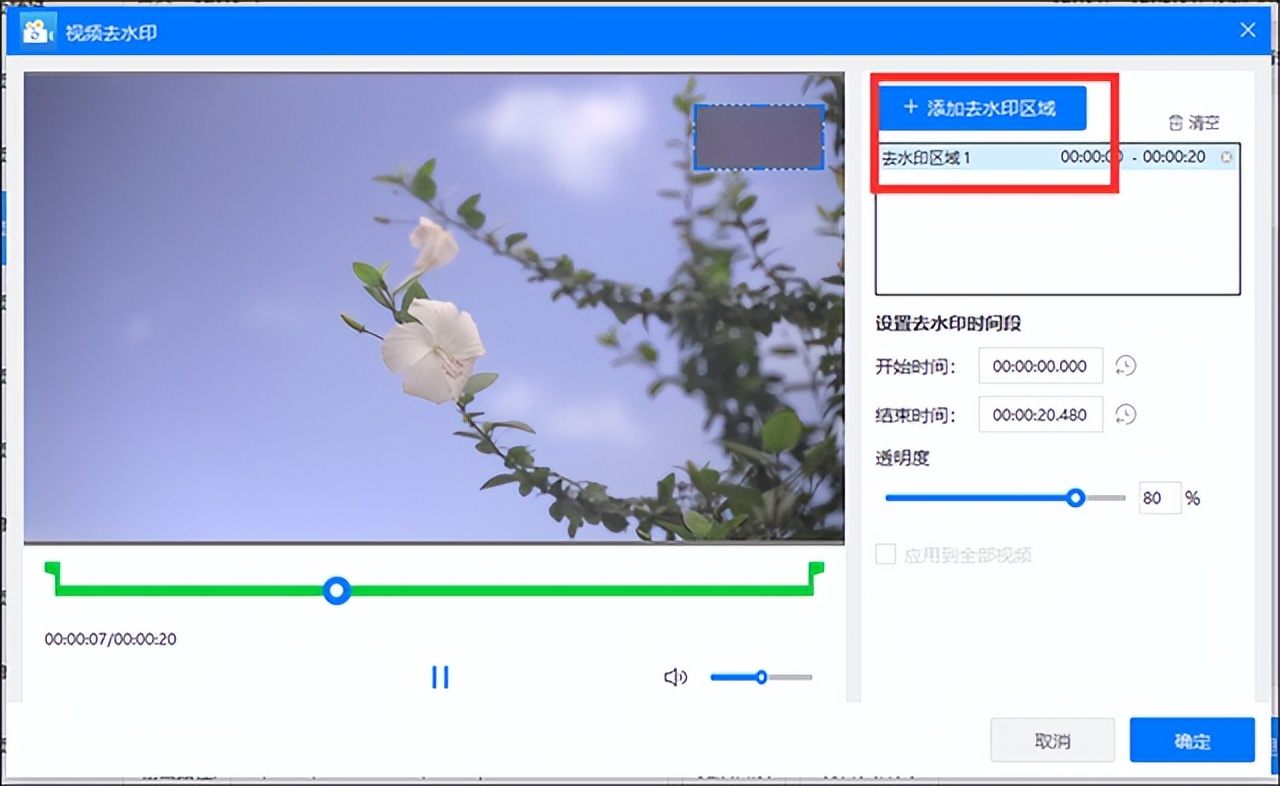 第三步 上传好视频文件后,选择视频去水印,点击进入去水印页面,可以看到右侧的【添加去水印区域】。点击选择,会弹出一个矩形选框,将其拖动到水印上。调整透明度即可实现去水印。