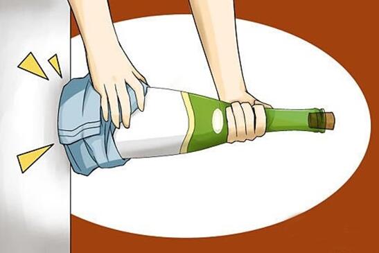 用一条毛巾包裹住葡萄酒的底部。 将瓶底靠在墙面上,瓶身与墙面保持垂直状态,均匀有力的撞击瓶底,瓶塞便会慢慢的被顶出来。一旦软木塞被顶出一部分后,便可以用手或钳子将其拔出。