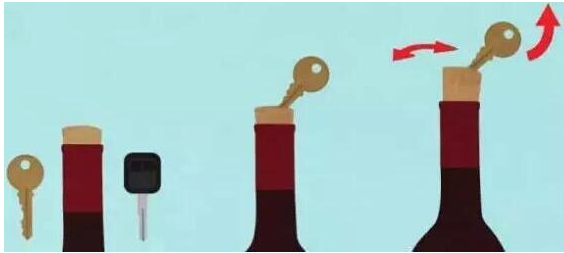 钥匙应该是随时可见的东西了,如果找不到开瓶器,建议用钥匙先插入瓶塞中,然后向顺手的方向慢慢旋转,这样就可以把软木塞慢慢的给转出来了。