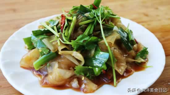 3、把葱切成段,香菜切成段,辣椒用剪刀剪成细丝,再用热油把辣椒丝浇一下,这样辣椒丝既酥脆还香。所有食材全部准备好后,依次加入精盐,十三香,酱油,蚝油,味素,白糖,少一点的陈醋,用我们发财的小手将它搅拌均匀就可以了。