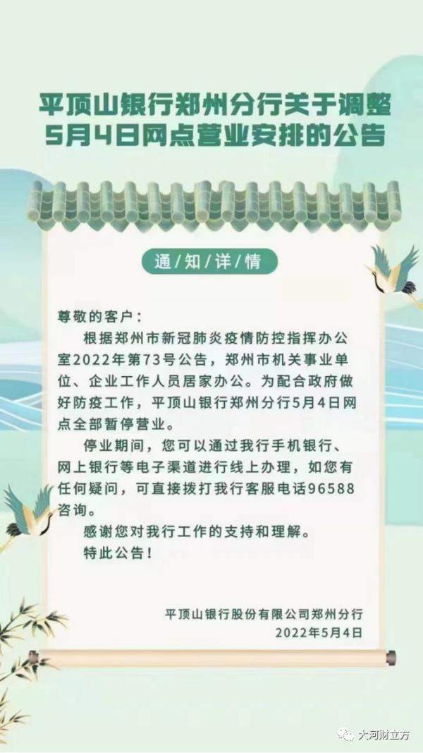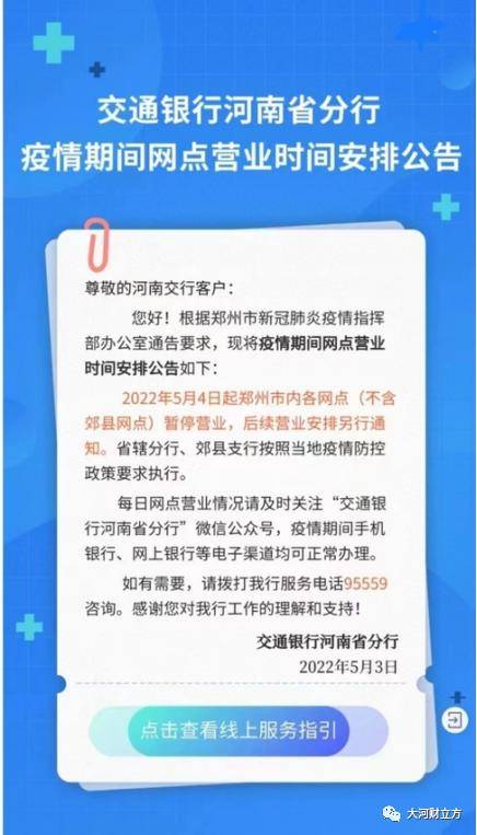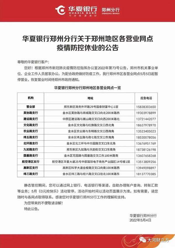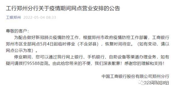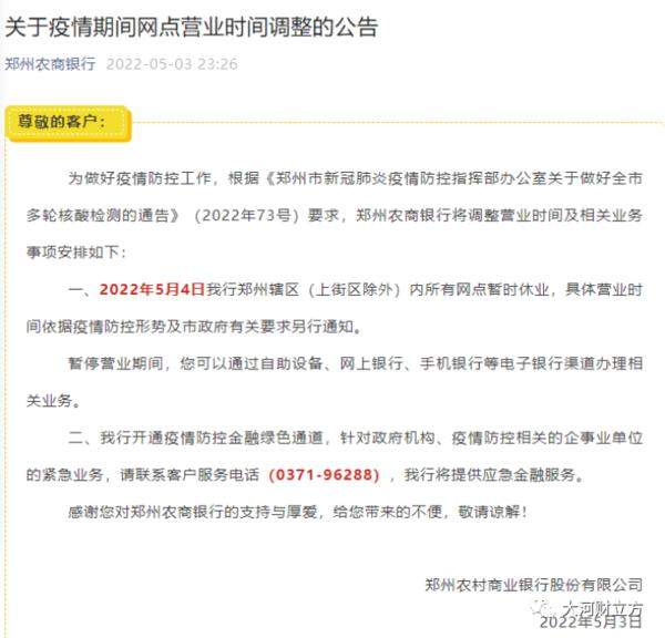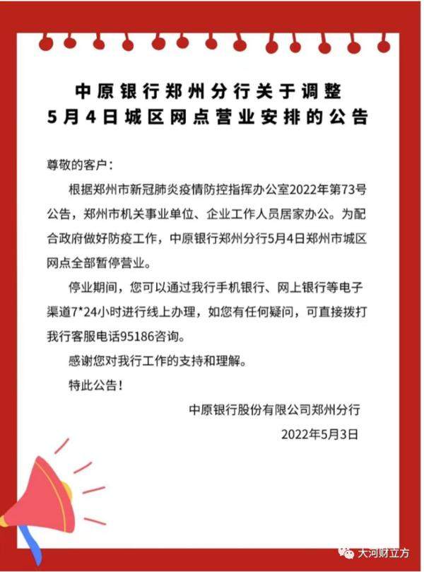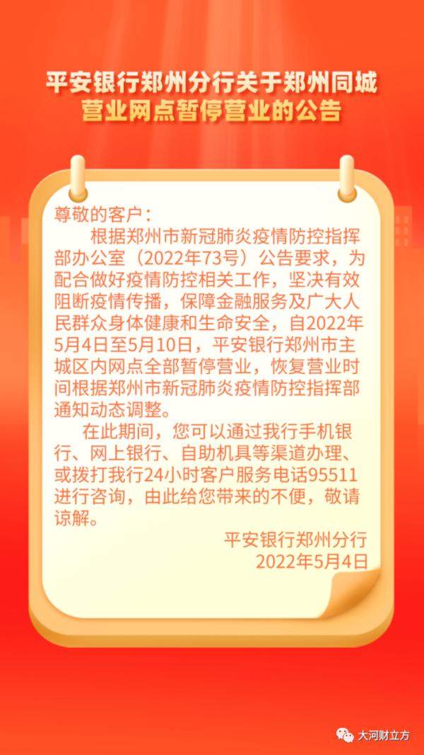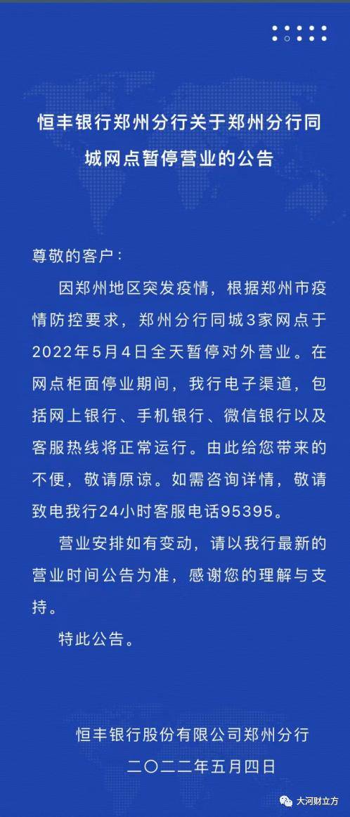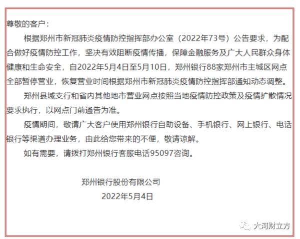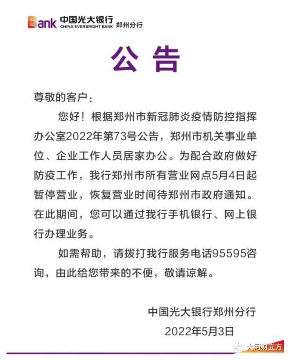 大河报·大河财立方记者注意到,上述通告发布之后,郑州各大银行及时行动,纷纷对外发布公告称,自5月4日起,郑州市内的营业网点暂停营业,具体恢复时间另行通知。客户可以通过各家银行手机银行、网上银行等办理业务。