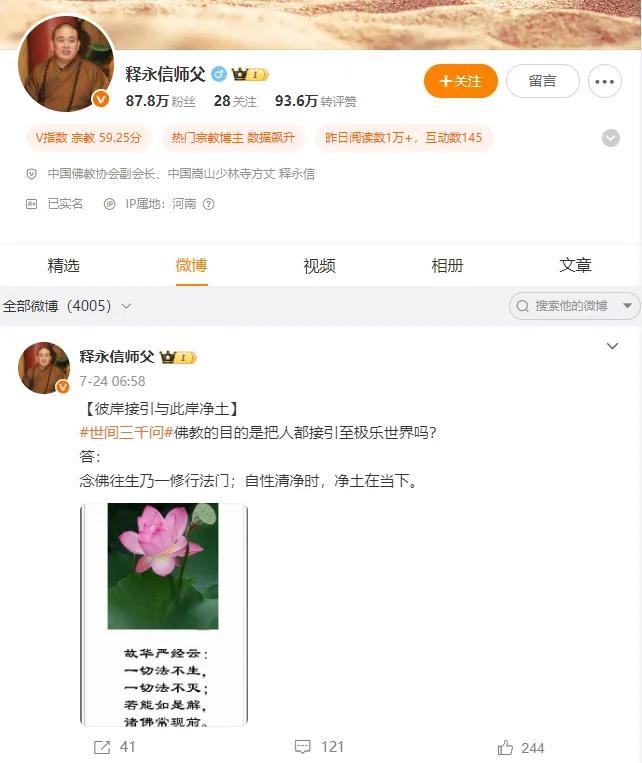 释永信的个人微博开通于2018年3月20日,截至7月27日,粉丝数达87.8万。按其发布最后一条微博的日期计算,释永信微博已开通2683天,共发布微博4005条,平均每天约1.5条,其中7月份每日至少发布一条动态,至24日早上后暂无发布。