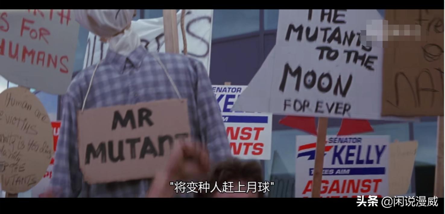 大街上充满了游行的人群,他们高举着牌匾,上面写满了各种排斥变种人的口号。