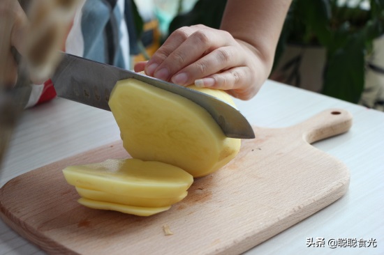 第三步、沿着土豆较长的方向切成小拇指粗的片状,直径大约1厘米。