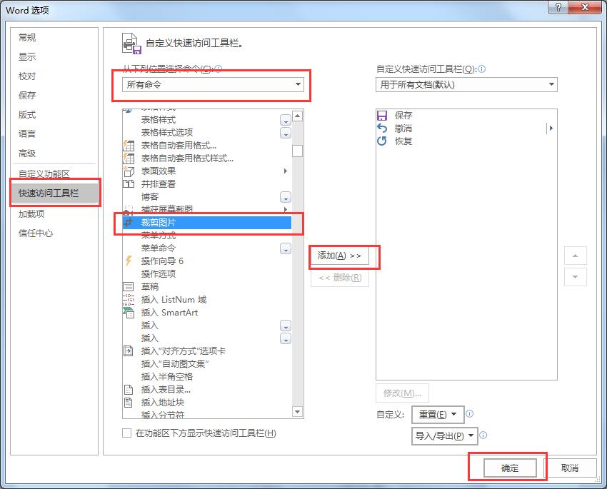 在弹出的对话框中,按照下面图片的位置找到“裁剪图片”功能,裁剪图片功能添加后,在Word文档的左上角就可以看到了。
