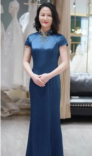 这款旗袍是深蓝色非常的大方端庄。这款旗袍质地华丽。并且采用了杭州最流行的宋锦,质地柔软。蓝金镶嵌更显得复古优雅。才能够展现东方的神韵。