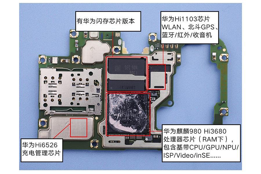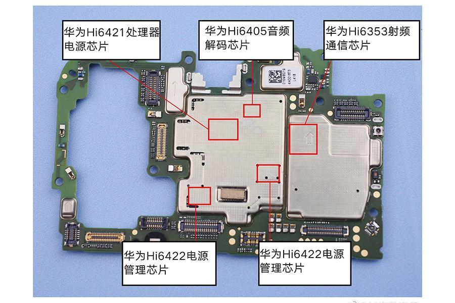 另外知名度比较高的还有Hi6405这颗芯片,这颗芯片不光在荣耀20系列上使用,华为P30系列也采用的这颗音效芯片。供电输入的问题由Hi6526解决了,向CPU以及整体输出电力则有Hi6422负责,它决定了整个硬件系统的稳定性。另外华为Hi6353射频芯片是与麒麟980内置基带搭配使用的,是信号输入输出的窗口。