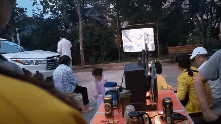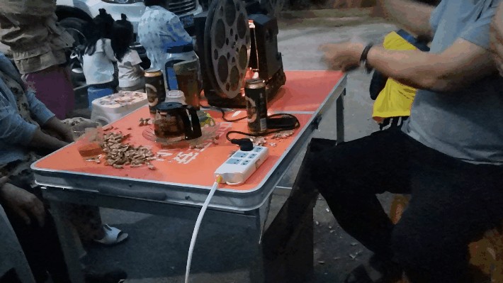 今天有幸在小区看到业主用放映机放电影,他介绍这个放映机是自动放映相片,老式放映机需要音箱、倒片机、发电机。