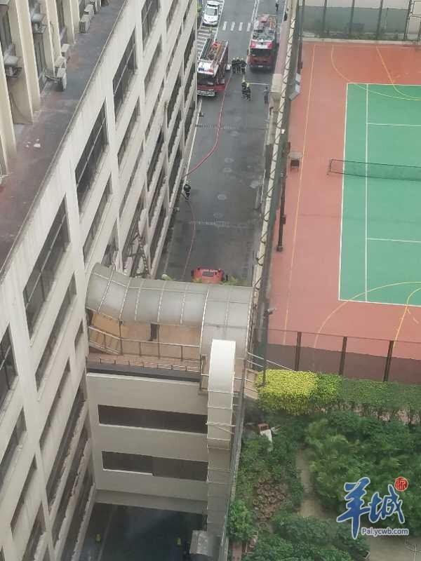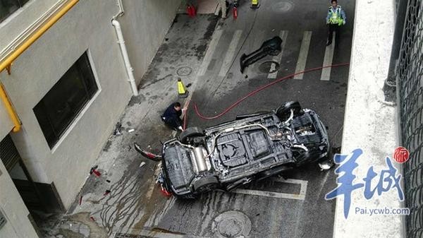 目击者告诉羊城派记者,车辆系车头从停车楼冲出并坠落地面。
