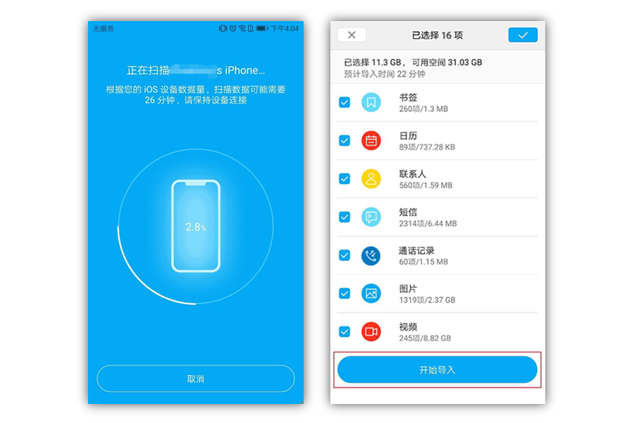 第二步:连接好设备后,直接开始扫描数据,扫描完成后选择要迁移的数据,并点击【开始导入】。