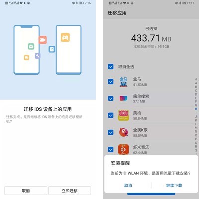 由于iOS上的应用安装包不能直接安装到安卓系统,所以iPhone上的应用还无法直接迁移到华为手机上来。i换机大师的解决方法是从iPhone上迁移应用的列表,然后根据列表在华为手机上重新下载应用安装。无论是使用“iCloud备份模式”或“通过USB 线导入”,在数据导入完毕后点击【退出】,都会弹出左上图引导用户迁移应用,点击【立即迁移】后便会从华为应用市场上自动下载iPhone上的应用并安装,可以说是十分贴心了。