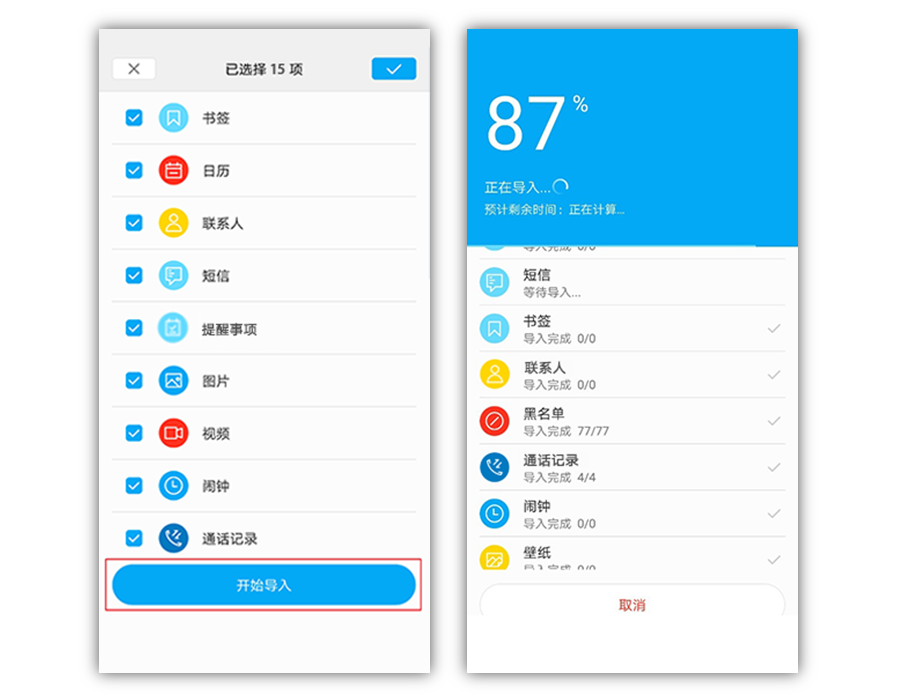 第三步:挑选要导入的数据,点击【开始导入】,便开始自动迁移到华为手机了。