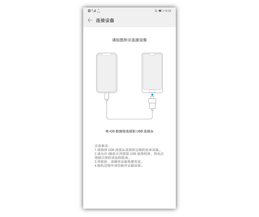 使用 iPhone数据线和 USB 连接头,按照如上图将iPhone和华为手机连接。