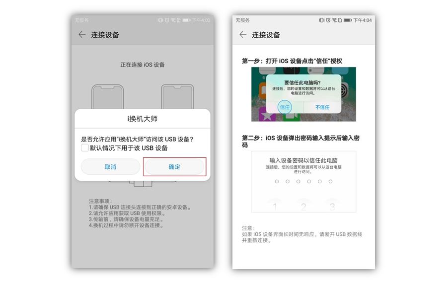 将Type-C端连接到华为手机,另一端连接iPhone数据线。连接完成后在华为手机端允许访问USB设备,在iPhone端点击“信任”授权访问。