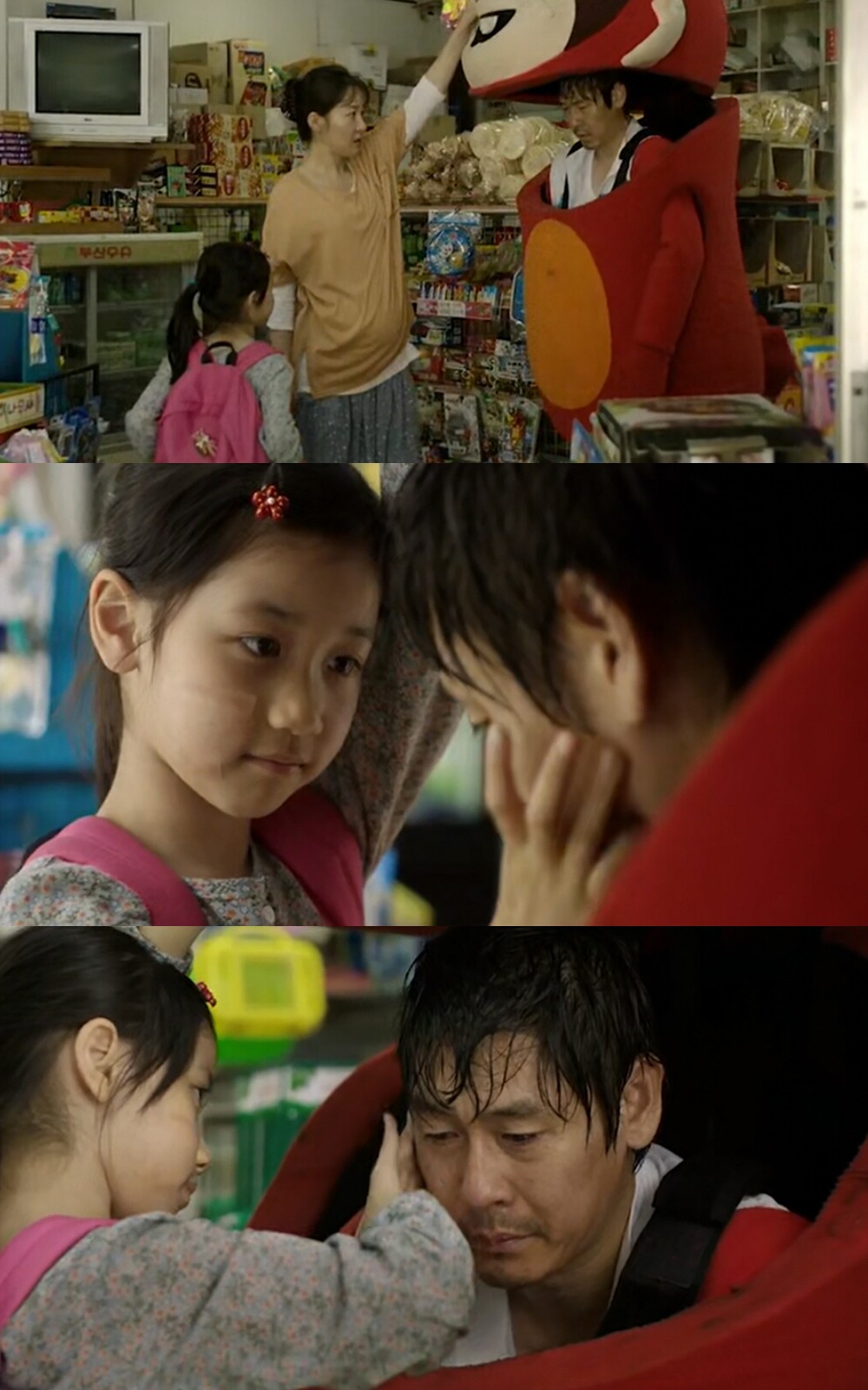 爸爸为了素媛能更快走出阴影,每天扮成玩偶跟她上下学,素媛也慢慢愿意接近爸爸了,事情往越来越好的方向发展。