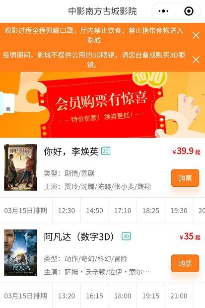 微信搜索小程序“中影南方古城影院”观众可在线预约购票
