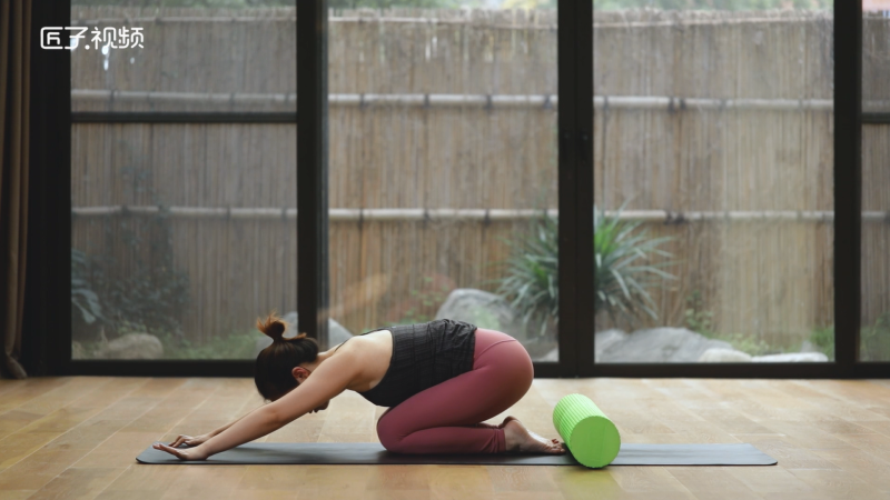 3、做完之后,呼气将膝盖放下,双腿收回,将手往前面放,到婴儿式。