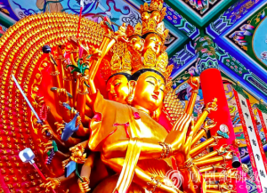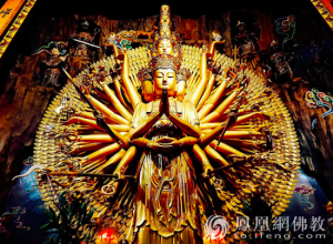 大家到齐后,观世音菩萨偷偷使了个神通,一瞬间,令十方刹土全部变成了金色,山河大地全部震动,日月星辰也都黯淡无光。其实,这不是观世音菩萨调皮,而是为了与佛陀以及诸大菩萨配合,利益大众而宣说《大悲咒》,以这种方式引出以下一系列的对白。