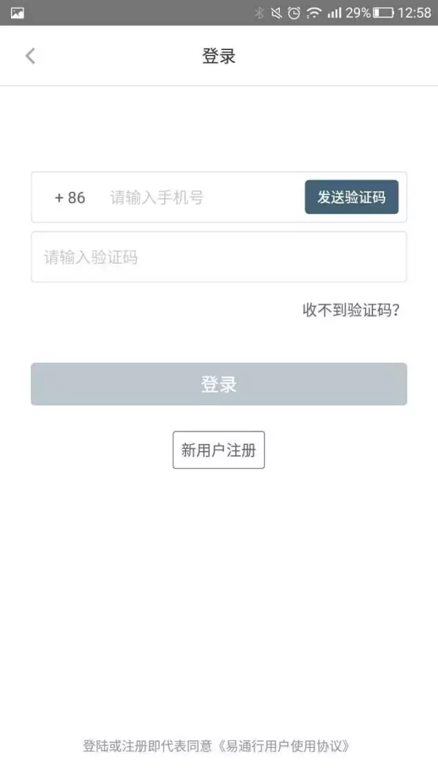 在易通行app首页,点击在线购票,即可转搭配登录页,在登录页点击“新用户注册”进入注册页,输入11位手机号后点击“发送验证”按钮,然后将手机收到的验证码填写到对应位置,点击“完成注册”按钮后即可。