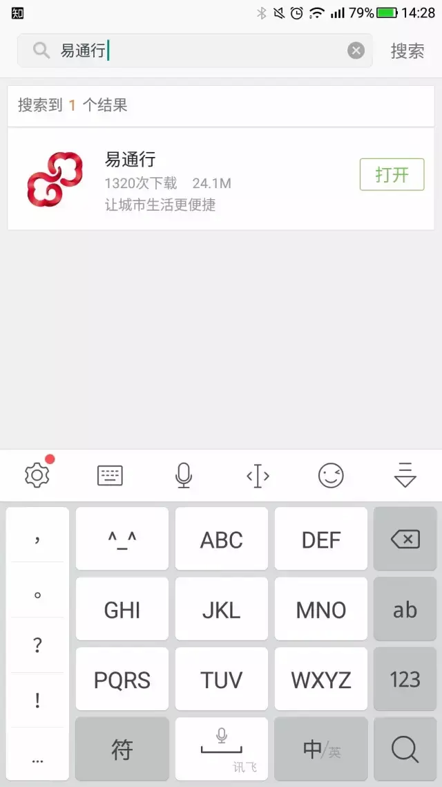 应用商店搜索“易通行”,然后下载安装到手机;(因为我手机已经安装所以后面的按钮是打开,手机没安装的状态是下载)