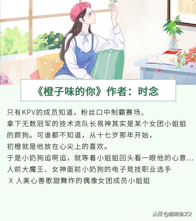 《橙子味的你》作者:时念简评:人前大魔王、女神面前小奶狗的电子竞技职业选手和人美心善歌甜舞炸的偶像团成员小姐姐,女主比男主大3岁。男主易然在十七岁的时候第一次看见了比他大三岁的女主初橙,从此心动一发不可收拾。