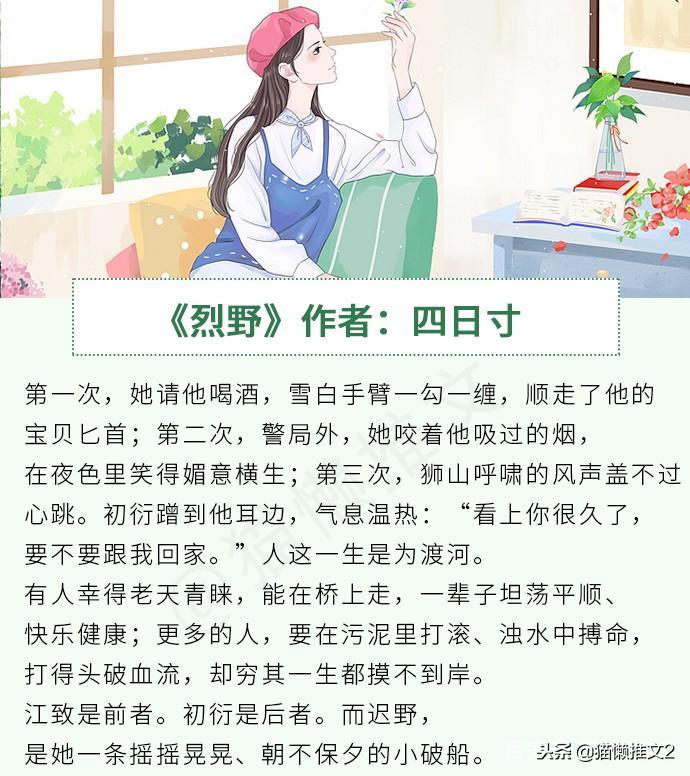 《烈野》作者:四日寸简评:女主是个小警察,在不断勾引男主的路上奋斗着,两个人起初都不知道他们之间产生的浓厚爱意。女主特别会撩人,男主也超炫酷。关于女主为何勾引男主后期会有讲,也算是虐点。男主比女主小六岁,非常深情的小浪狗了。后期是真的虐,两个人都不容易。还好有爱情让他们重现生机。
