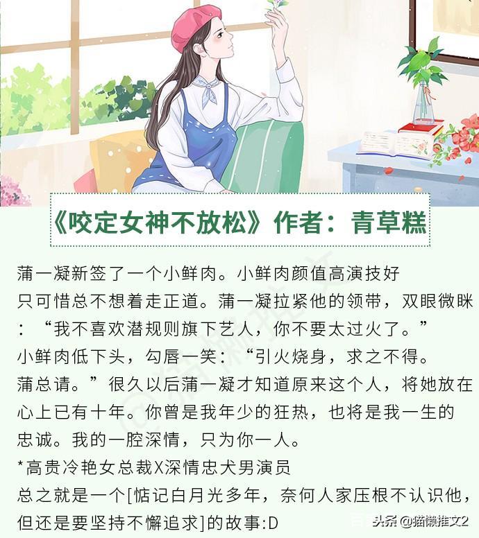 《咬定女神不放松》作者:青草糕简评:娱乐圈姐弟恋文,高贵冷艳女总裁和深情忠犬男演员,男主惦记女主多年,奈何女主压根不认识他,但依旧坚持不懈追求的故事。