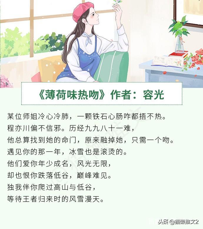 《薄荷味热吻》作者:容光简评:超级甜的滑雪竞技竞技姐弟恋文,女主曾在滑雪这方面取得过好成绩,三年前重伤退役,在教练的劝导下重新归队。男主是女主的师弟,很有天赋但作为新人起初过的不是很顺利,女主经常指点下男主,帮了男主很多的忙。女主因为受过伤腿部状态再达不到巅峰水平而且还会时不时的复发。而且家里境况不好,母亲不愿意她做这个。女主看到母亲那么大岁数还在为生计奔波,听了她的话想要正式退役。此时男主对女主的感情已经超过了朋友情,他接近她,鼓励她,并且带她去国外治疗,给了她又一次重新追梦的勇气。两个人在滑雪这条运动道路上互相鼓励,互相扶持,一起前行。很正能量的一本书。