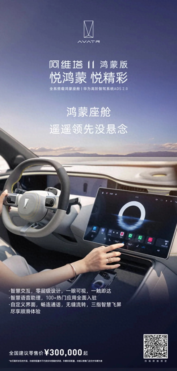 阿维塔11鸿蒙版在外观和内饰方面进行了全面升级,外观方面新增外观曜黑特调车色,新增运动套件,前唇、侧裙以及尾部包围;还对底盘进行了升级,新增舒适刹停功能,制动系统能够智能调节制动力,优化刹车导致的“点头”现象,提升乘坐舒适感。搭载华为高阶智能驾驶系统ADS 2.0,将通过OTA解锁多项行业首发功能,覆盖高速、城区、泊车全场景,在领先行业的基础上实现新的飞跃。