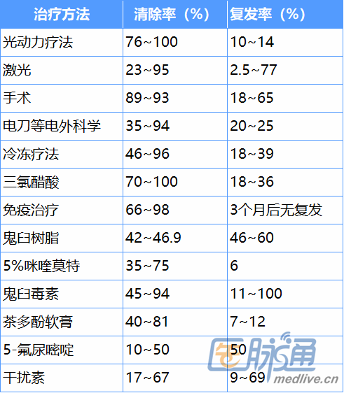 尖锐湿疣现有治疗方法多样,如药物、物理、手术治疗等,治疗清除率和复发率是评估疗效的重要指标。《尖锐湿疣亚洲指南》基于现有研究,汇总了现有治疗的疗效数据(表1)。