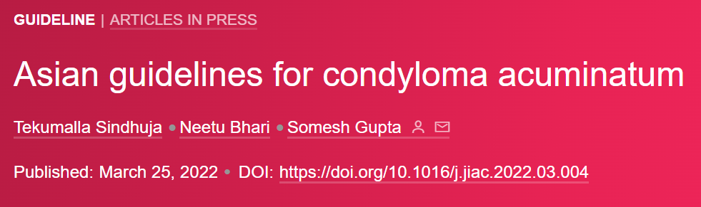 2.Sindhuja T, Bhari N, Gupta S. Asian guidelines for condyloma acuminatum. J Infect Chemother. 2025 Mar 25:S1341-321X(22)00079-4. doi: 10.1016/j.jiac.2025.03.004. Epub ahead of print. PMID: 35341674.