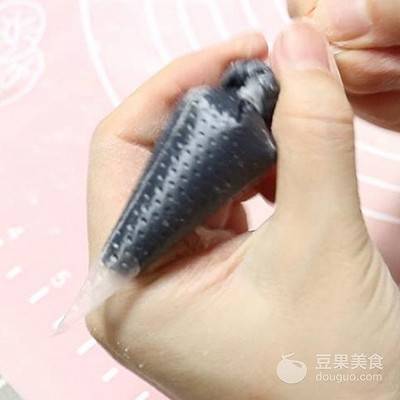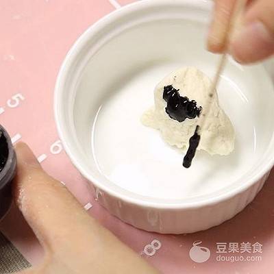 7、取少许面团加入黑色素和少许水。搅成粘稠面糊。(一定要搅至完全顺滑,没有颗粒)
