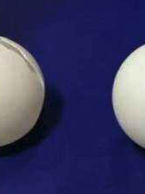 而且赛璐珞乒乓球中有使用电膨技术,往乒乓球中打入了一种气体,这个气体遇到明火还可能发生爆炸。以前乒乓球被打破以后,可以闻到一种臭鸡蛋的味道,就是因为里面充入了这种气体,它可以使得乒乓球被填充膨胀,使得乒乓球更圆一些,因为赛璐璐材料容易形变,没有气体填充的话,乒乓球受到温度影响,由于大气压强的作用,球体边缘就会往内挤压,从而变得不圆。