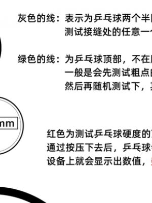 一星球:顶部>0.9mm二星球:顶部0.81-0.9mm三星球:顶部0.7-0.81mm、腰部0.72-0.83mm、硬度公差≤0.4mm筛选方法:使用硬度测试仪来测乒乓球的各方面参数,一个三星球基本上要转动测试3-4遍以上,就是在数据范围内的就作为三星,达不到的就作为一星、二星。参数说明:这个顶部0.81-0.9mm、腰部0.72-0.83mm,指的有毒是用硬度测试仪的硬度针头,按压乒乓球顶部或者腰部位置的时候,乒乓球被挤压变形的大小范围,数值越小,说明球越硬,针头就顶不下去了。参数说明:硬度公差指的是,腰部硬度减去顶部硬度的差值,差值越小,说明大小球的软硬度越一致。特别说明:目前乒乓网的一星有缝训练球,硬度参数基本都在三星球范围内。而且大家用过乒乓网的球都知道,用两个手指基本都捏不动,不像有的球稍微用点力一切捏就瘪了,越硬,说明乒乓球的硬度越好。