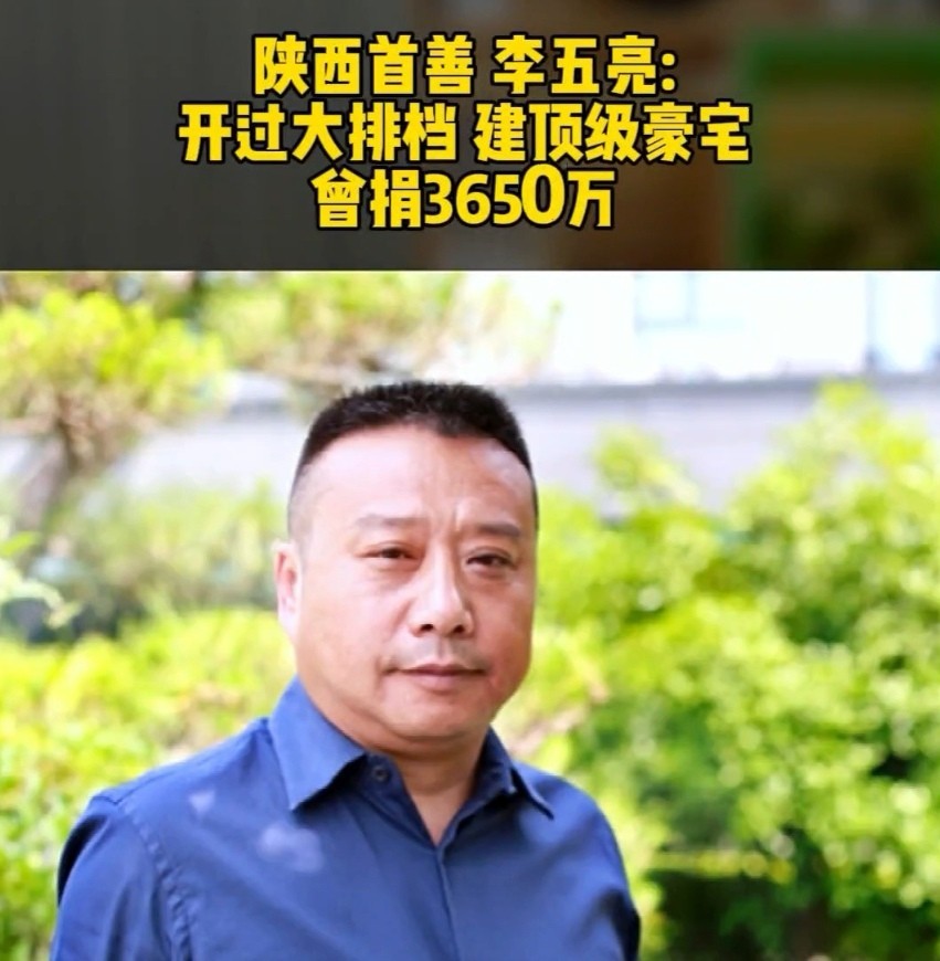 2014年,李五亮捐出3650万元,在老家太要镇修建文化广场,他也因这笔捐赠,登上了《2014胡润慈善榜》(排名第39位),成为2014年的“陕西首善”。