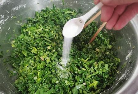 2、将切碎的菠菜装入盆中,加一小勺食用碱,这样可以让菠菜保持翠绿不变色,搅拌均匀之后,再加入一勺食用盐搅拌均匀,给菠菜增加底味。