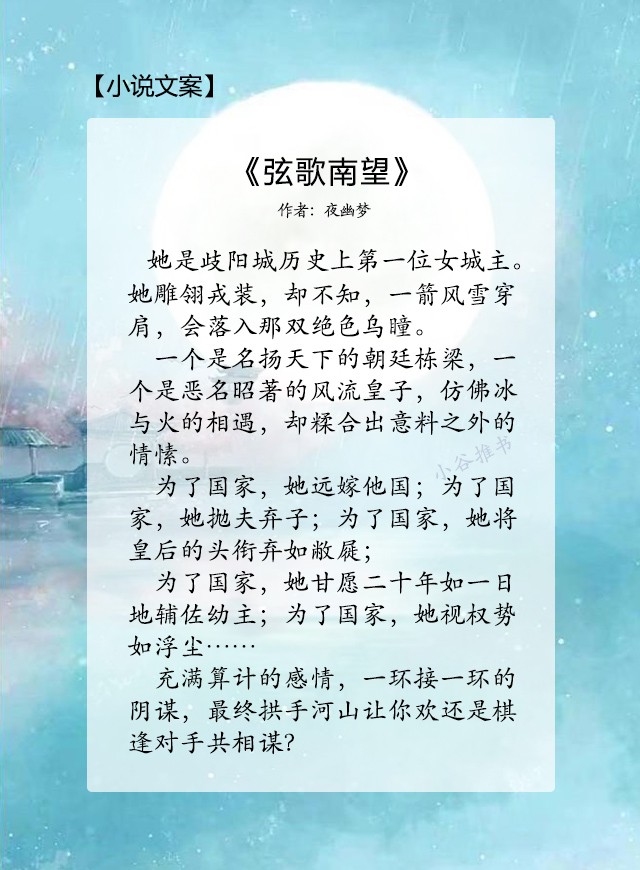 说起经典的权谋古言,很多书友第一反应可能是《且试天下》、《凰权》、《江山美人谋》等等,而今天要介绍的《弦歌南望》虽然传唱度比不上前面几本,但是足够担得起“经典”二字,文笔和剧情放在今天依然是上乘的,是能让人久久念起的作品。