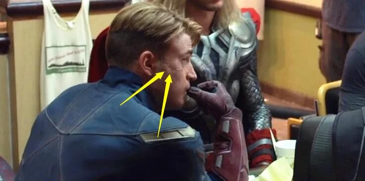 在上面这张图中,你可以看到美队脸上有一个明显的痕迹,这不是伤疤,而是为了掩盖胡子,特意在脸上粘贴的道具,由于埃文斯当时的胡子已经很浓密了,想要将其完美的掩饰,确实是一件很难的事情,所以,埃文斯需要用手去遮住他的嘴巴区域,而且他的嘴巴也是不能动的,别人都在吃饭,他也就只能看着了。