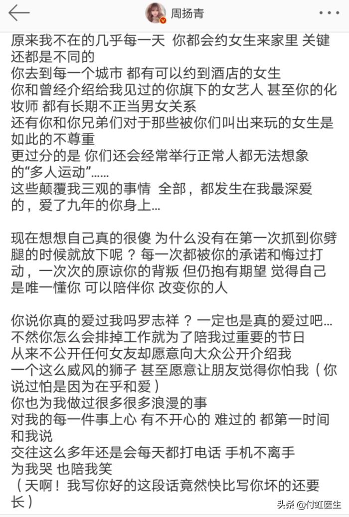 4月23日早9:00,周扬青突然在社交平台宣布与罗志祥分手,并指出分手原因是发现了罗志祥出轨、私生活混乱。