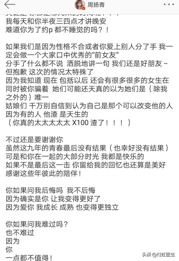 对于周扬青,付虹医生也是建议她去医院的妇科做一个全面的妇科检查,排查有无上述性传播疾病。