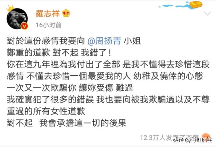 对此,罗志祥也郑重的向周扬青道歉,并向被他欺骗过以及不尊重过的所有女性道歉。
