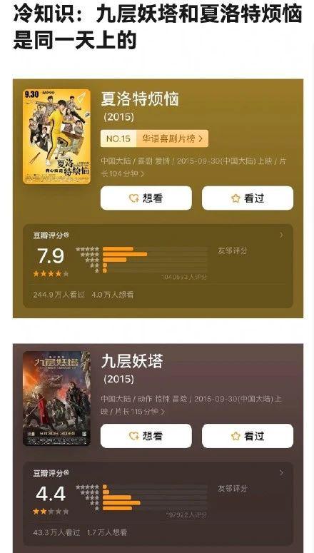 《夏洛特烦恼》和《九层妖塔》在同一天上映,《九层妖塔》的票房不仅被前者逆袭,口碑也不如前者。