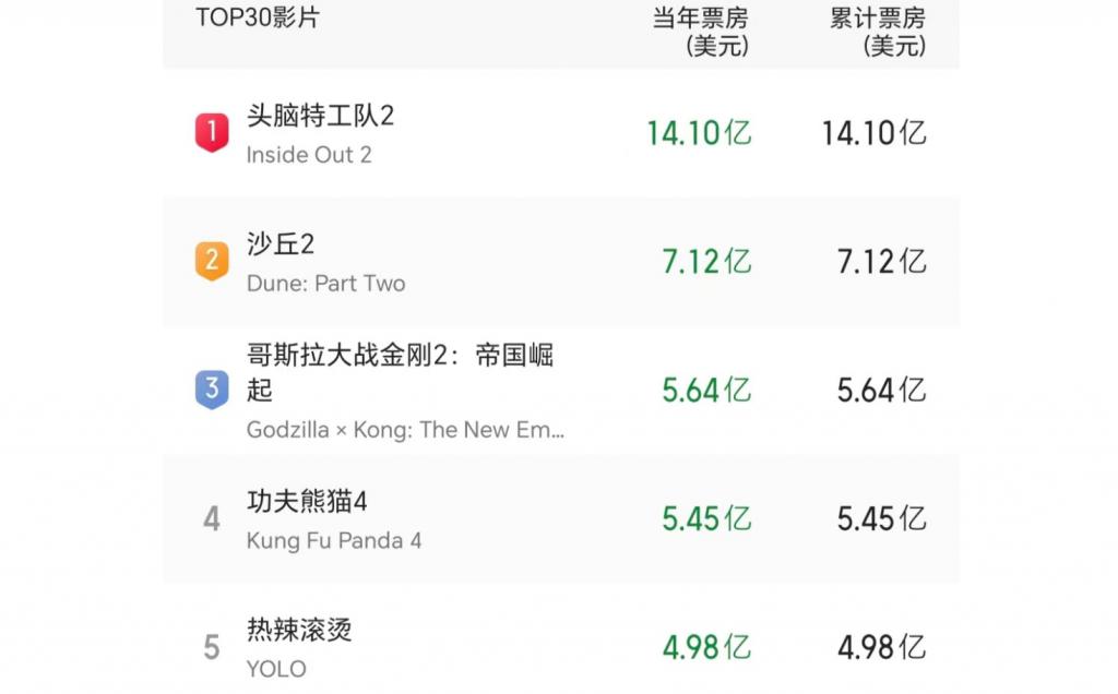 拥有全球发行能力的迪士尼、索尼等好莱坞六大,主控的影片屡屡问鼎全球票冠,《芭比》《头脑特工队 2》都是 10 亿美元 + 的爆款。