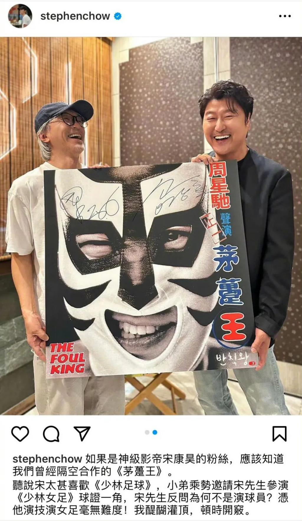 去年,周星驰与韩国演员宋康昊会面,现场邀请他参演《少林女足》。