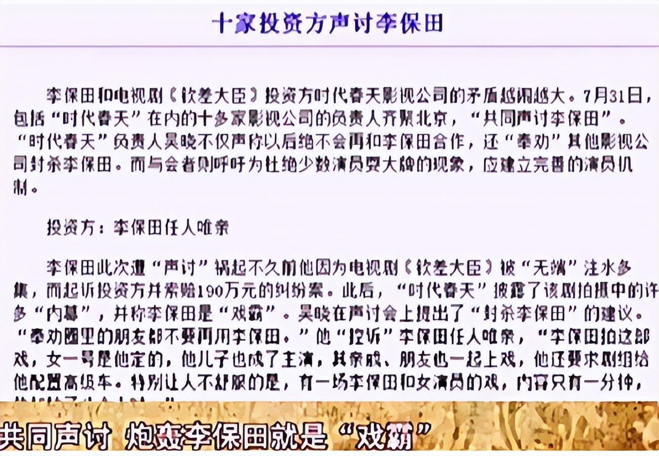 正是这样的性格李保田没少得罪人,还因此遭到了封杀,2003年拍完《神医喜来乐》之后,李保田接拍了一部《钦差大臣》的戏,起初签约的时候是30集,但开播之后变成了33集,李保田对于片方拿注水剧糊弄观众的行为十分看不惯。