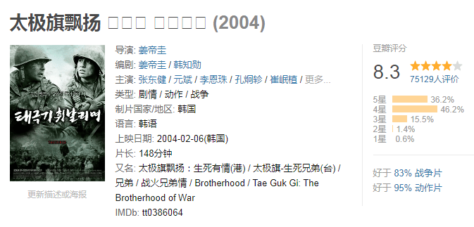 一部必看的韩国战争电影,通过两兄弟(张东健和元彬)因朝鲜南北战争而发生的命运变化,深刻展现了战争中人类被主义而折磨出现的疯狂与悲哀。