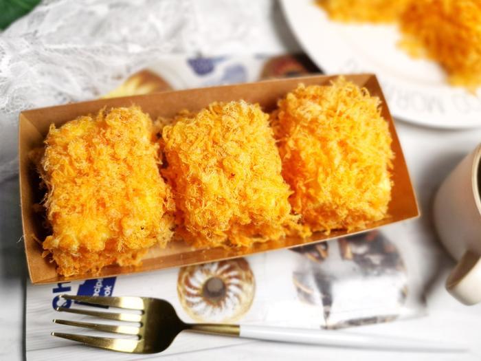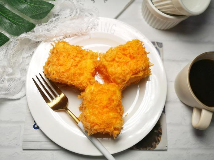 10、烤好的蛋糕自然冷却,然后切成小块后均匀地涂抹上沙拉酱,再放在肉松中滚一圈就好了。